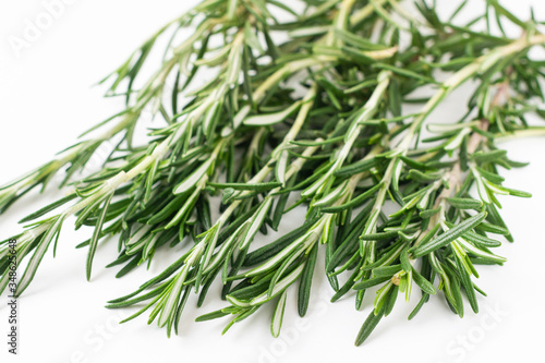 Fototapeta premium Fresh bouquet of rosemary leaves in a white ceramic bowl on white light...