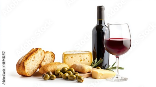 Naklejka premium Fresh bread cheese olives wine glass bottle gourmet food table setting culinary casual appetizer snack drink arrangement