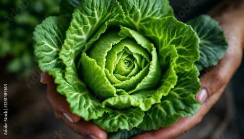 © Ghus, Fototapeta premium Fresh cabbage on palm hands HD image. Fresh vegetable background