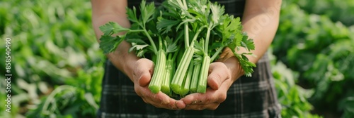 © Аrtranq, Obraz premium Fresh Celery Stalks in Farmer's Hands