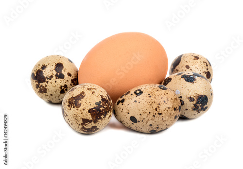 Fototapeta premium Fresh chicken and several quail eggs on white background