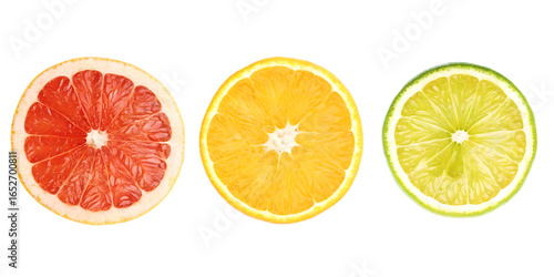 © MDPARVEZ, Fototapeta premium Fresh citrus fruit slices on white background