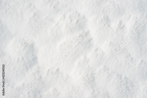 © Сyrustr, Fototapeta premium Fresh clean white snow background texture. Winter background with frozen snowflakes and snow mounds. Snow lumps. Seasonal landscape details. Cold weather.
