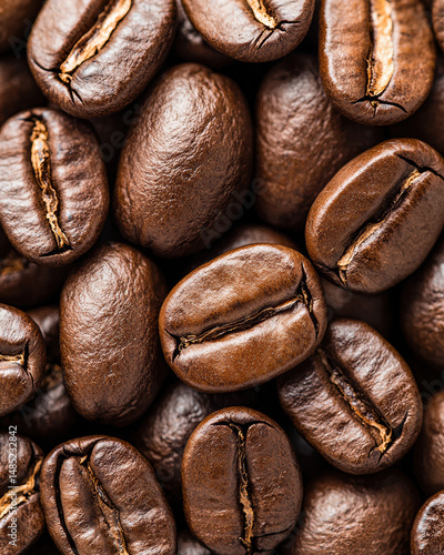 © Pui, Naklejka premium Fresh coffee beans close-up, showcasing their rich texture and glossy surface, perfect for any coffee lover.