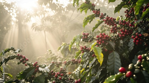 Fototapeta premium Fresh coffee berries from plantation farm at sunrise in a foggy morning.