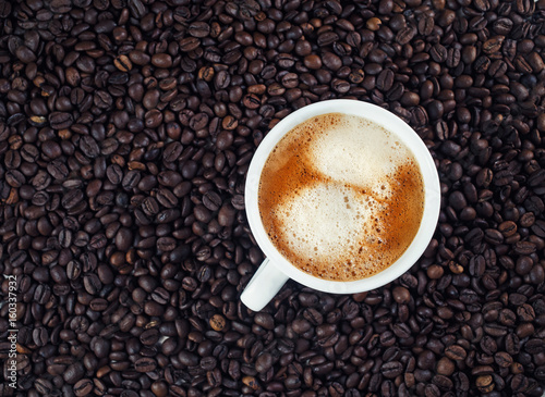 Fototapeta premium Fresh coffee cup on coffee beans background.