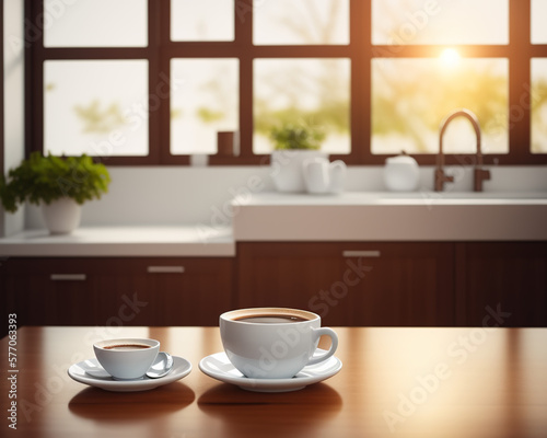 Fototapeta premium fresh coffee in a cozy sunny spring kitchen interior, created using...