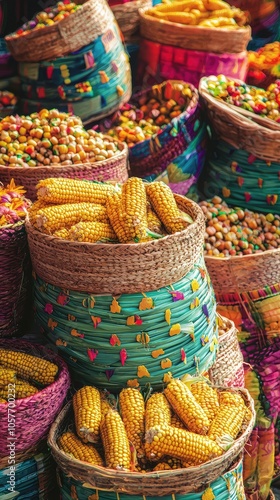 Fototapeta premium Fresh Corn Baskets at Farmers Market