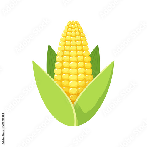 Obraz premium Fresh corn on the cob with husk, illustration of yellow sweetcorn with green...