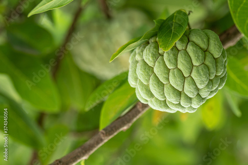 © lllonajalll, Fototapeta premium Fresh custard apple, sugar apple background and texture. Annona growing on a tree.