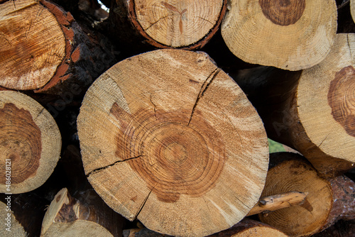© Koray, Naklejka premium Fresh cut pine tree logs in the forest