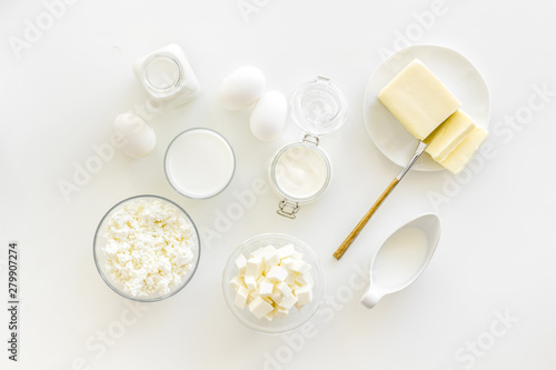 Fototapeta premium Fresh dairy products for breakfast with milk, cottage, eggs, butter, yougurt on white background top view