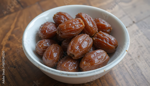 © Anvesh, Obraz premium "Fresh Dates in White Bowl on Wooden Surface – Natural Sweetness and Texture"