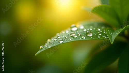 Fototapeta premium Fresh Dew Drops on Leaf, Nature in Detail View