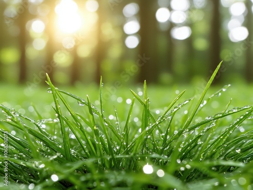Fototapeta premium Fresh dewy grass in sunlight with a blurred forest background.