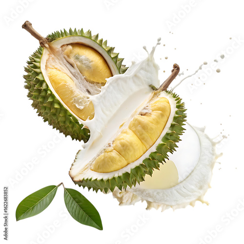 Obraz premium Fresh durian fruit splashing with milk isolated on transparent background