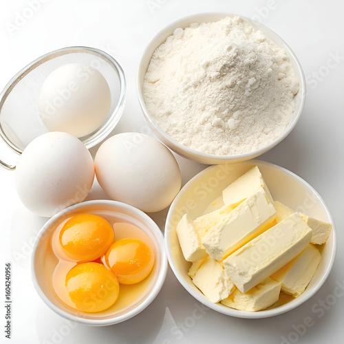 © Samia, Fototapeta premium Fresh eggs, fine flour, and creamy butter arranged neatly, isolated on a bright white background.