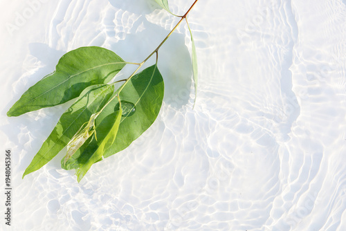 © Bowonpat, Fototapeta premium Fresh eucalyptus leaves floating in clear water with sunlight ripple patterns