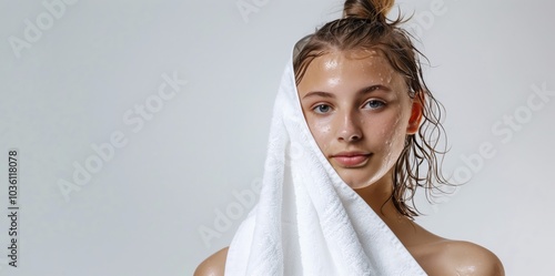 © Unnamed Bird, Obraz premium Fresh-Faced Woman with Wet Hair Wrapped in a Towel