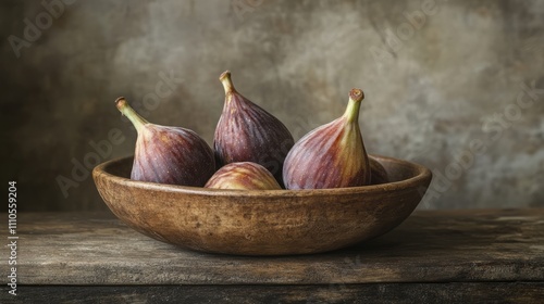 Fototapeta premium Fresh figs are arranged in a shallow wooden bowl resting on a weathered...