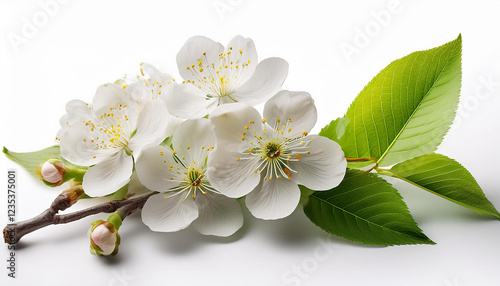 © Madyson, Fototapeta premium fresh flora and leaves of prunus tree isolated on white or obvious background spring flowering