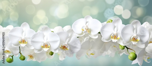 © Ilgun, Obraz premium Fresh floral background with blooming white moth orchid flowers Macro shot in a greenhouse with copy space image