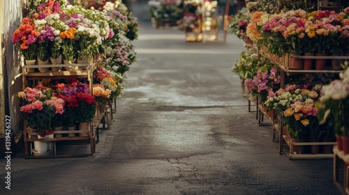 © dee-nesia, Fototapeta premium Fresh Flower Market Stalls in a Cozy Urban Setting