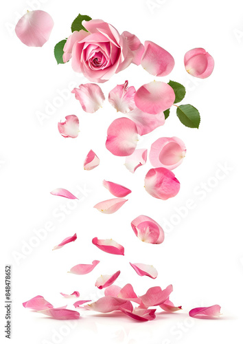 © Oleksiy, Fototapeta premium Fresh flying pink petals of rose and leaves isolated on white