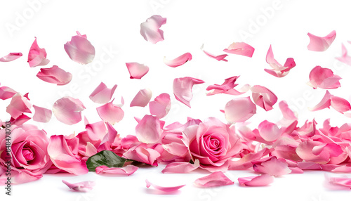 © Oleksiy, Fototapeta premium Fresh flying pink petals of rose and leaves isolated on white