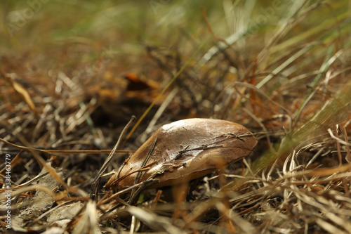 Fototapeta premium Fresh forest mushroom in pine needles, close up