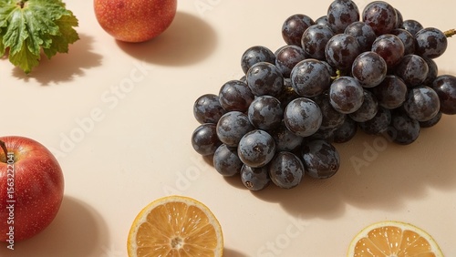 © Ajigus, Obraz premium Fresh fruit arrangement on a light beige background.