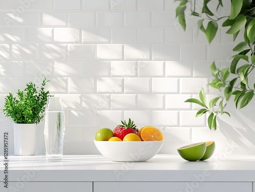 © Muhammad, Obraz premium Fresh fruit bowl on white kitchen countertop, sunlight, plants, modern interior