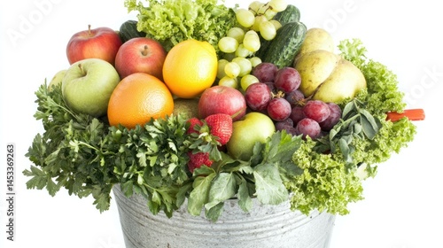 Fototapeta premium Fresh fruits and vegetables in bucket on white, bright and healthy.