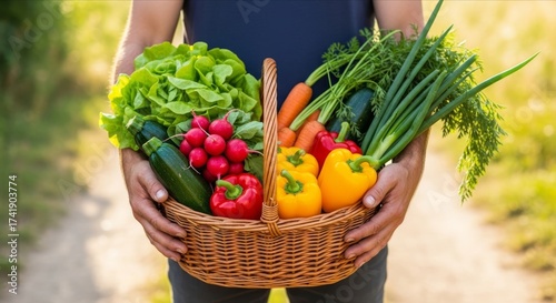 © Ngoc, Fototapeta premium Fresh Garden Harvest – Farmer Carrying Basket of Vegetables