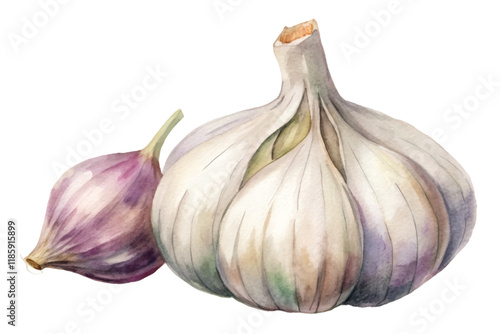 Obraz premium Fresh garlic bulb, vibrant watercolor style, culinary ingredient, healthy...