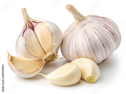 © MDShafiqul, Obraz premium Fresh garlic bulbs and cloves isolated on a white background for culinary use