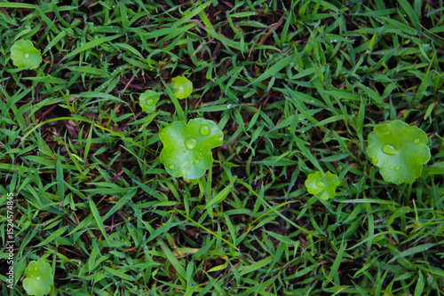 © Bowonpat, Fototapeta premium Fresh gotu kola leaves with dew drops on grass