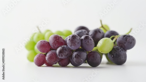 © Shozib, Fototapeta premium Fresh green and black grapes with water drops seen in close-up on a white background