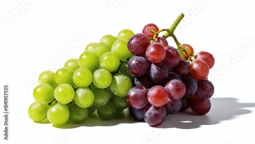© Shahadat, Fototapeta premium Fresh green and red grapes with water droplets on white background