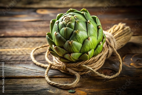 © Suralai, Obraz premium fresh green artichoke bundle rustic table