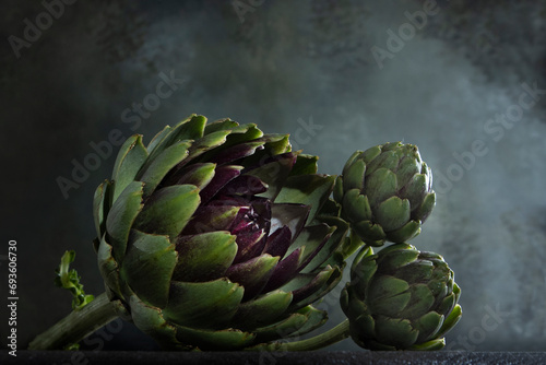 © Alla, Obraz premium Fresh green artichoke on a blurred background. Artichokes on a dark background. Copy space.