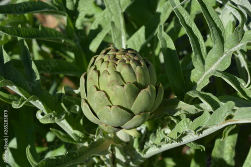 © Josie Elias, Obraz premium Fresh green artichoke, ripe on the plant