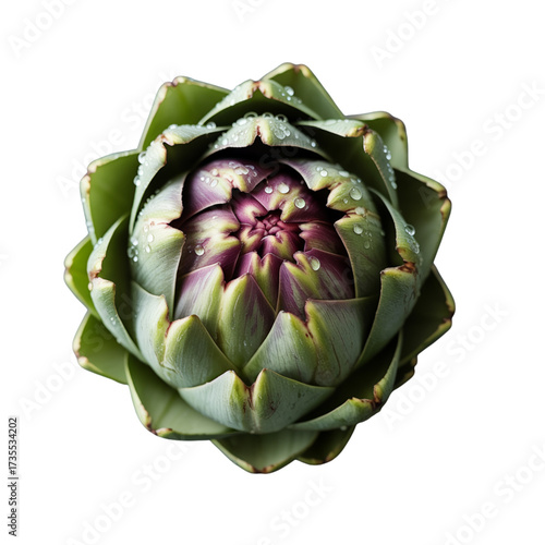 © Sahina, Obraz premium Fresh green artichoke with purple center on black background