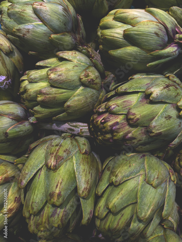 © Fotografia Juan Reig, Obraz premium Fresh green Artichokes. Organic local produce vegetable. Vegan diet. Clean eating concept. Close up, top view, flat lay.