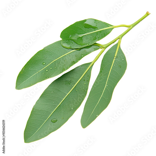 Fototapeta premium Fresh green bay leaves with droplets of water on a white isolated background.