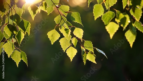 © Newton, Fototapeta premium fresh green birch leaves backlit by the sun with sunbeams against a dark blurred background