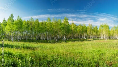 © AustinSANC, Fototapeta premium Fresh green birch trees (Betulaceae ) with blue sky. Forest summer sprig nature landscape background banner wide panoramic panorama