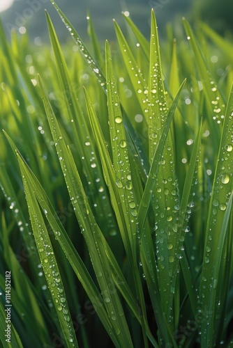 Fototapeta premium Fresh green blades of grass with tiny water droplets, great for representing...