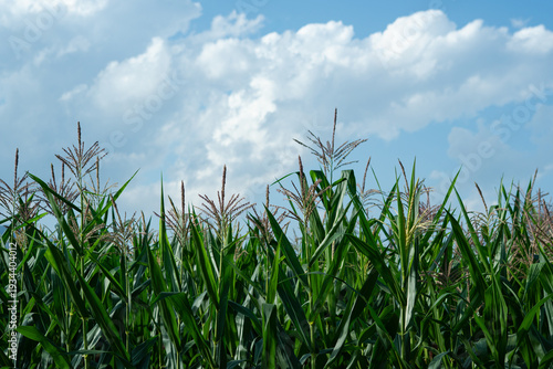 © Elder Stidio, Fototapeta premium Fresh green corn orchard on a bright blue sky day