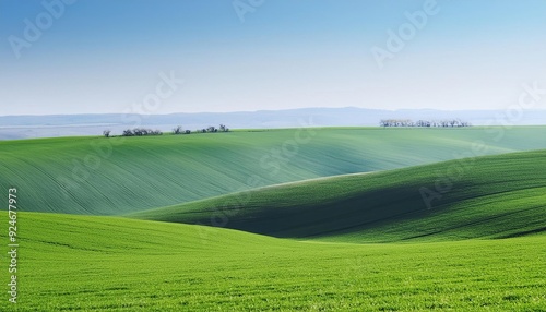 Obraz premium Fresh green fields in spring with a blue sky backdrop on a hill